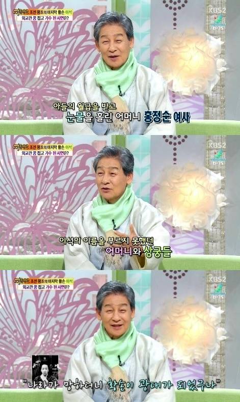 마지막 황손 이석이 어머니와 얽힌 일화를 고백했다.이석은 4일 오전 방송된 KBS 2TV '여유만만'에 출연해 비운의 역사 속 왕자로서 순탄치 않았던 파란만장한 자신의 삶을 털어놨다.이석은 1941년 의친왕의 마지막 후실 홍정순 여사 사이에서 태어났으며, 의친왕의 13남 9녀 중 11번째 아들이다.이날 마지막 황손 이석은 "아버지 의친왕은 날 62세에 낳으셨다. 어머니는 옛 관습대로 19세였다"면서 "옛날 왕가에서는 가능했던 일이다"고 말했다.또한, 이석은 후궁 출신의 어머니에 대해 "어머니와 상궁들은 내 이름을 못 불렀다. 항상 '아씨 마마'나 '아기 마마'라고 불렀다"고 밝혔다.이석은 가수가 됐을 당시를 회상하며 "왕실에서 반대해 몰래 DJ를 했다. 하지만 가수를 하고 TV에 나오니 큰어머니인 순정효황후가 '나라가 망하더니 왕족이 가수를 하는구나. 광대가 되버렸구나'하고 우셨다. 그래서 내가 족보에서만 빼지 말라고 울었다"라고 전했다.[마지막 황손 이석, 사진=KBS2 '여유만만' 방송 캡처]