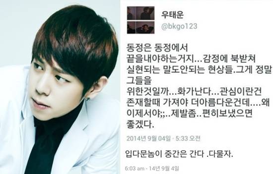 블락비 지코(본명 우지호·22)의 형이자 스피드 멤버 우태운(24)의 트위터 발언이 논란이 되고 있다.우태운은 지난 4일 자신의 트위터에 "동정은 동정에서 끝을 내야 하는 거지. 감정에 북받쳐 실현되는 말도 안 되는 현상들. 그게 정말 그들을 위한 것일까"라고 시작하는 글을 게재했다.이어 "화가 난다. 관심이란 건 존재할 때 가져야 더 아름다운 건데. 왜 이제서야. 제발 좀 편히 보냈으면 좋겠다"고 덧붙였다.이는 걸그룹 레이디스코드 故 은비(22,고은비)의 생전 소원인 '음원 1등'을 이뤄주기 위한 움직임에 대한 발언으로 보인다. 레이디스코드의 '아임 파인 땡큐(I'm fine thank you)'는 네티즌들의 노력으로 주요 음원사이트에서 1위를 차지했다.우태운 발언을 접한 네티즌들은 "우태운 넌 뭐냐?", "레이디스코드 1위한 게 배 아픈 듯", "가만히 있으면 중간이라도 간다", "팬들의 선의를 저렇게 왜곡하다니..", "레이디스코드 은비를 두 번 죽이는 발언", "우태운 최악의 망언" 등의 비난을 쏟아냈다.[우태운 발언 논란, 사진=코어콘텐츠미디어/ 우태운 트위터 캡처]