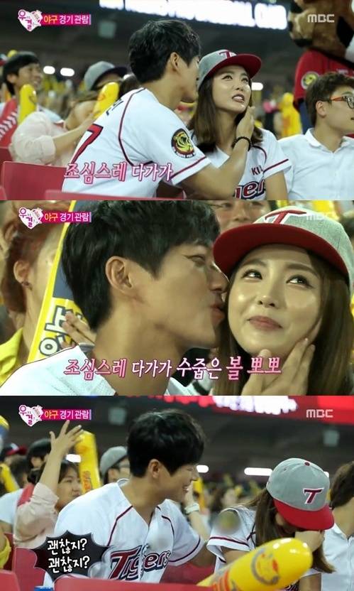 '우리결혼했어요' 남궁민이 홍진영에게 볼키스를 했다.지난 6일 방송된 MBC '우리 결혼했어요4'(이하 '우결')에서는 남궁민과 홍진영이 야구장 데이트를 하는 모습이 그려졌다.이날 홍진영의 고향 광주를 방문한 남궁민과 홍진영은 기아 타이거즈 시타와 시구를 위해 야구 경기장을 찾았다.두 사람은 시타와 시구를 마치고 경기를 관람하던 중 키스타임의 주인공이 됐다. 카메라가 비추면 키스를 해야하는 이벤트로 카메라가 남궁민과 홍진영을 비춘 것.이에 두 사람이 가볍게 포옹을 하자 관중들은 야유를 보냈고, 결국 남궁민은 홍진영에게 조심스럽게 다가가 볼에 뽀뽀를 했다.이어진 인터뷰에서 홍진영은 "되게 민망했다. 앞에 커플이 너무 진하게 뽀뽀를 해서 신경이 쓰였다. 첫 키스는 둘만 있을 때가 가장 좋을 것 같다는 생각이 들었다"고 털어놨다.[우리결혼했어요 남궁민, 사진=MBC '우리 결혼했어요' 방송 캡처]