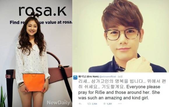에릭남 역시 트위터에 "리세. 삼가고인의 명복을 빕니다. 위에서 편히 쉬세요. 기도할게요. 리세와 리세 주변의 이들을 위해 기도해주세요. 그녀는 정말 놀랍고 친절한 사람이었습니다"라며 권리세의 죽음을 애도했다.