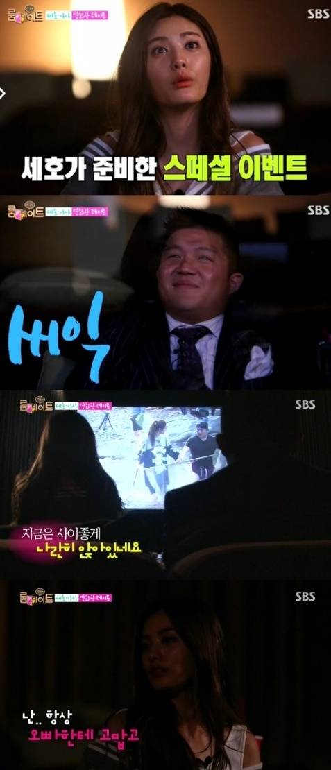 '룸메이트' 조세호가 나나에게 특별한 이벤트로 감동을 선사했다.조세호는 지난 7일 방송된 SBS '일요일이 좋다-룸메이트'(이하 '룸메이트')에서 영화관을 통째로 빌려 나나와 데이트에 나서는 모습이 그려졌다.이날 조세호 나나는 공포영화 데이트를 즐기며 즐거운 시간을 보냈고, 영화가 끝난 뒤 또 다른 영상이 나오자 나나는 깜짝 놀랐다.이는 조세호가 준비한 스페셜 이벤트로 공개된 영상에는 지난 5개월간 함께한 '룸메이트' 속 조세호와 나나의 모습이 담겨 있었다.조세호가 준비한 영상을 본 나나는 "우리 진짜 엄청 싸웠구만"이라며 "친해져서 정말 좋다. 항상 오빠한테 고맙고 그냥 좋다"고 화답했다.[조세호 나나, 사진=SBS '룸메이트' 방송 캡처]