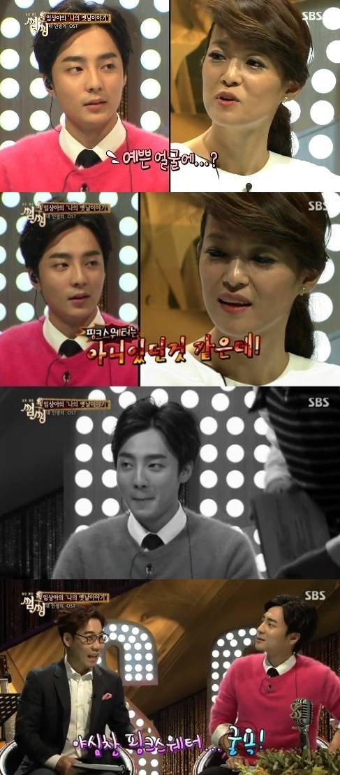 디자이너로 변신한 가수 겸 배우 임상아가 로이킴의 의상을 지적했다.지난 9일 방송된 SBS 추석특집 '열창클럽 썸씽'(MC 강호동 김정은)에는 최백호, 박근형, 박혁권, 이필모, 임상아, 악동뮤지션 등이 출연해 가수들과 콜라보레이션 무대를 선보였다.이날 임상아는 디자이너답게 로이킴의 패션에 대해 "그 예쁜 얼굴에 핑크스웨터는 아니었던 것 같다"면서 "얼굴은 귀공자인데 핑크스웨터는 아니라고 생각한다"고 돌직구를 날렸다.이에 당황한 로이킴은 스타일리스트를 향해 손가락을 가리키며 발끈했고, 김연우는 "아까부터 계속 덥다고 했다"고 밝혔다.이어 로이킴이 "사실 털이 자꾸 코에 붙는다. 숨을 못 쉬겠다"고 솔직하게 말하자 강호동은 "캐시미어?"라고 물었고, 로이킴은 "앙고라"라고 답해 폭소를 자아냈다.['썸씽' 임상아 로이킴 의상지적, 사진=SBS '썸씽' 방송 캡처]