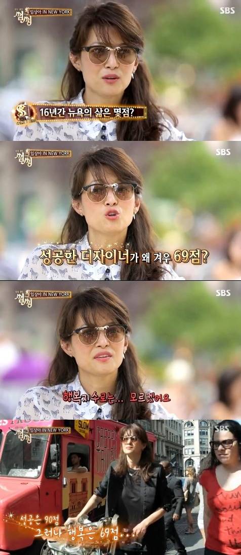 임상아가 미국 뉴욕에서의 삶은 되돌아봤다.지난 9일 방송된 SBS 추석특집 '열창클럽 썸씽'(MC 강호동 김정은)에는 최백호, 박근형, 박혁권, 이필모, 임상아 등이 출연해 가수들과 콜라보레이션 무대를 선보였다.이날 임상아는 "16년간 뉴욕에서의 내 삶을 평가하면 69점이다. '단 1초도 놓지 않고 열심히 살았다'라는 부분은 90점이상 줄 수 있을 것 같다"고 고백했다.이어 "행복지수로는 모르겠다. 그래서 69점이다"고 털어놨다.['썸씽' 임상아, 사진=SBS '썸씽' 방송 캡처]