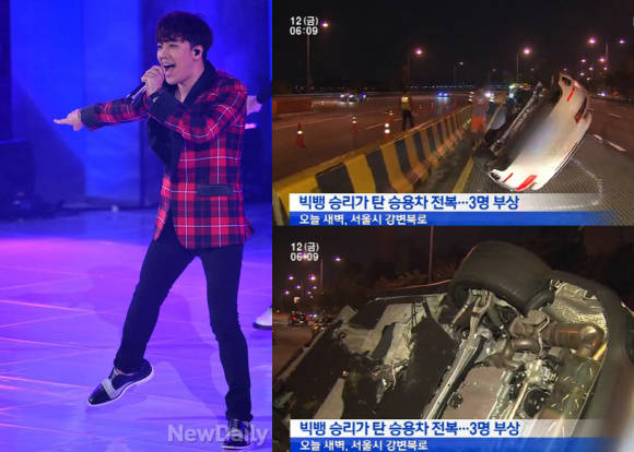빅뱅 승리가 노나곤 론칭 파티 참석 후 교통사고를 당했다.승리는 11일 밤 강남구 논현동의 한 클럽에서 열린 소속사 YG엔터테인먼트의 패션 브랜드 '노나곤' 출시 기념행사에 소속 연예인들과 함께 참석했다.노나곤은 YG엔터테인먼트가 제일모직과 손잡고 선보인 패션 브랜드로 YG와 제일모직이 공동 설립한 네추럴나인을 통해 출시됐다.승리 소속사 YG엔터테인먼트 관계자는 12일 "음주운전은 아니다"라며 "다행히 외상은 입지 않았지만 가수 보호 차원에서 병원에 입원해 정밀 진단을 받을 예정이다"고 전했다.한편, 승리는 12일 새벽 3시35분쯤 서울 강변북로 반포대교에서 일산방향으로 달리던 중 앞서 가던 벤츠와 중앙분리대를 잇달아 들이받은 뒤 전복됐다. 이 사고로 앞 차에 타고 있던 54살 이 모 씨 등 3명은 병원으로 옮겨져 치료를 받고 있다.경찰은 승리가 과속으로 차를 몰다 사고를 냈을 가능성이 있다고 보고 목격자 등을 상대로 정확한 사고 경위를 조사하고 있다.[승리 교통사고, 사진=뉴데일리 DB/KBS1 뉴스 영상 캡처]