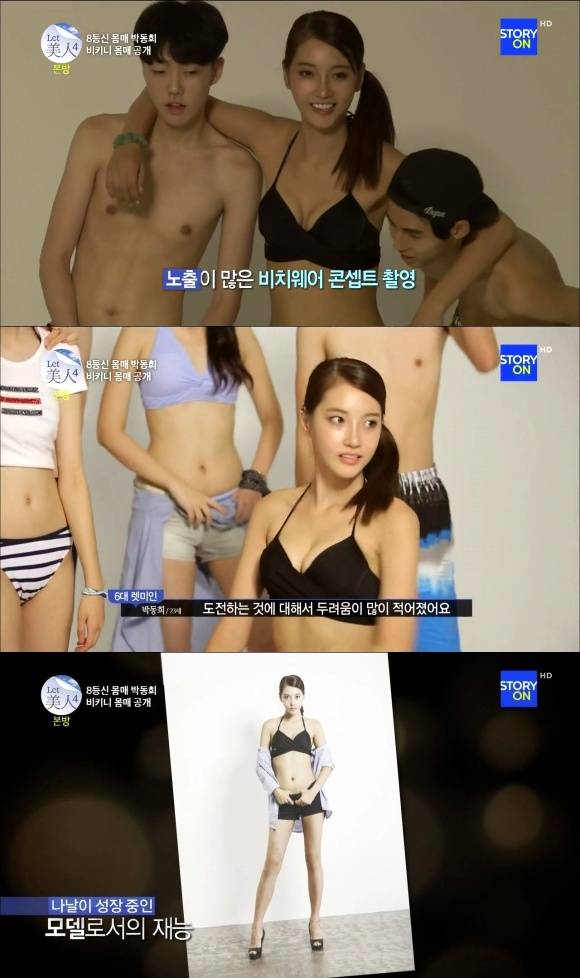 '렛미인' 박동희가 8등신 비키니 몸매를 공개하며 온라인을 후끈 달구고 있다.지난 11일 방송된 스토리온 '렛미인4' 마지막회는 '렛미인 그 후'라는 주제로 마련된 가운데, 우울한 과거에서 슈퍼모델 비주얼로 변신한 박동희의 모델 도전기와 일상 모습이 전파를 탔다.이날 박동희는 "세계적인 모델 에이전신데 오디션을 개최한다. 유명한 모델들을 발굴한 곳이라 나간 다는 것 자체가 영광스러울 것 같다"며 "과거와 비교하면 대회에 참가 지원을 하는 내 모습이 정말 많이 변한것 같다"고 말했다.이후 박동희는 예비모델들과 비치웨어 화보 촬영에 나서며 비키니 몸매를 공개해 눈길을 끌었다. 그녀는 블랙 비키니 위에 셔츠를 걸쳐 입고 자신감 넘치는 포즈를 취했다.특히, 박동희는 181cm의 늘씬한 기럭지와 운동으로 다져진 탄탄한 몸매를 과시했으며, 예뻐진 외모와 함께 볼륨몸매를 드러내 시선을 집중시켰다.박동희는 모델 아카데미 원장 김영민 씨로부터 대회에 참가하기에 부족하다는 평을 듣고도 프로모델 도전을 포기하지 않았다. 결국 각고의 노력 끝에 글로벌 모델 대회에 참가한 박동희는 당당하게 본선에 진출했다.한편, 박동희는 스토리온 '렛미인4' 7화에 출연해 거구 잇몸녀에서 181cm의 늘씬한 몸매와 모델 포스 외모로 변신해 화제를 모은 바 있다.[렛미인 박동희, 사진=스토리온 '렛미인4' 방송 캡처]