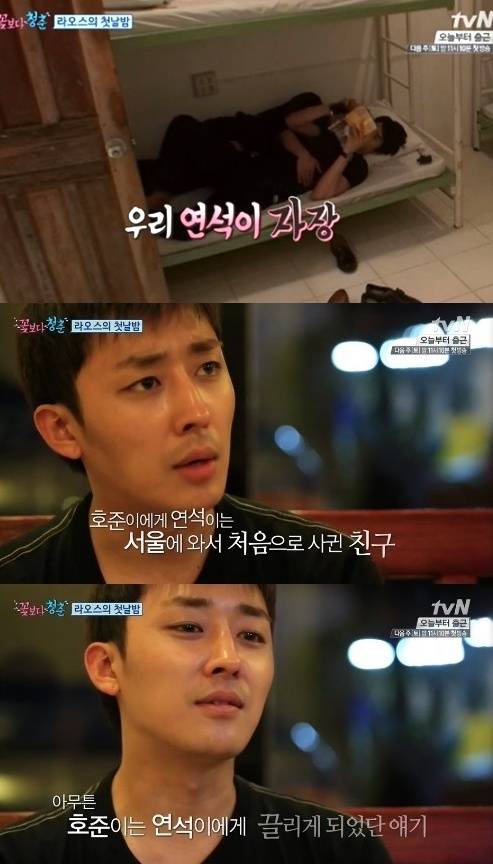 '꽃보다 청춘' 손호준이 유연석에 대한 남다른 우정을 드러냈다.지난 12일 첫 방송된 tvN '꽃보다 청춘' 라오스 편에서는 유연석 손호준 B1A4 바로 세 사람이 블랙 수트 차림으로 정신없이 동남아시아 라오스로 배낭 여행을 떠나는 모습이 그려졌다.이날 '꽃보다 청춘' 유연석과 손호준은 내일 일정을 찾아보던 중 한 침대에 누워 자연스러운 스킨십을 하며 애정을 드러냈다.손호준은 제작진과의 인터뷰에서 "서울 와서 친구를 사귄 건 유연석이 처음이다. 그래서 남달랐다. 집착은 아니지만 그냥 연석이에게 끌리게 된다"고 말했다.또한, '숙소에서 가장 좋은 게 뭐냐'는 제작진의 질문에 손호준은 "연석이와 함께 있다는 것"이라고 답해 훈훈함을 자아냈다.동갑내기인 유연석과 손호준은 지난해 방송된 tvN 금토드라마 '응답하라 1994'를 통해 돈독한 우정을 쌓고 있다.['꽃보다 청춘' 유연석 손호준, 사진=tvN '꽃보다청춘' 라오스편 방송 캡처]