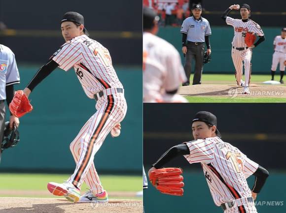 배우 조인성이 한밭야구장을 후끈 달궜다.조인성은 14일 오후 대전 한밭야구장에서 열린 2014 한국야쿠르트 세븐 프로야구' 한화 이글스-기아 타이거즈 경기에서 시구자로 나섰다.앞서 조인성은 아이스 버킷 챌린지에 동참하면서 동명이인인 한화 조인성을 지목한 바 있다. 이에 한화 조인성은 아이스 버킷 챌린지에 참여하며 배우 조인성에게 시구를 부탁했다.이날 한화 조인성과의 약속을 지키기 위해 시구에 나선 배우 조인성은 한화 이글스 유니폼을 입고 마운드에 올라 프로선수 못지 않은 완벽한 폼으로 공을 던졌다.조인성 시구를 본 야구해설가 허구연은 "제가 본 시구 중 인상적인 시구 중 하나다. 조인성의 투구 동작이 좋았다. 스트라이크 존에 집어넣었다"며 칭찬을 아끼지 않았다.한편, 한화 이글스는 조인성 시구 효과 덕으로 시즌 8번째 매진을 기록했다.[조인성 시구, 사진=연합뉴스]