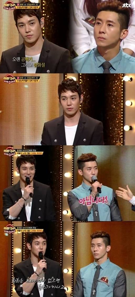 '히든싱어' 환희가 브라이언과의 불화설을 일축했다.플라이투더스카이 환희는 지난 13일 방송된 JTBC '히든싱어3'에 네 번째 원조가수로 출연해 다섯 모창 능력자들과 대결을 펼쳤다.이날 환희와 함께 '히든싱어'에 출연한 브라이언은 오랜 공백 기간이 불화설 때문 아니냐는 질문에 "불화설이 아니다"라고 단호하게 밝혔다.이에 환희는 "브라이언이 없으면 환희가 아니고 환희가 없으면 브라이언이 아니다. 내 옆에는 항상 브라이언이 있고, 플라이투더스카이는 영원하다. 항상 서로의 옆에 있겠다"고 전해 훈훈함을 자아냈다.[히든싱어 환희, 사진=JTBC '히든싱어3' 방송 캡처]