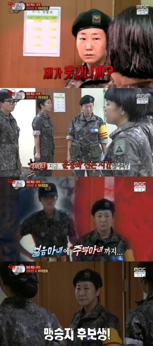 라미란이 얼음마녀 훈육관 몾지않은 당직사관으로 변신해 동기들을 쏘아붙였다.14일 방송된 MBC '일밤-진짜사나이' 여군특집에서는 부사관 후보생으로 교육중인 여군 멤버들의 점호시간이 전파를 탔다.이날 홀로 당직사관 임무를 부여받은 라미란은 "뇌가 40대인데 미치겠다 무슨 수능시험 보는 것 같다. 시상식 레드카펫에 가는 것보다 더 떨린다"고 말하며 엄청난 긴장감에 식은땀을 흘렸다.하지만 라미란은 점호가 시작되자 걱정했던 것과 달리 매의 눈으로 생활관을 체크하기 시작했다. 특히, 한 동기가 웃자 "웃습니까. 제가 웃깁니까. 제가 웃기게 생겼습니까"라고 호통을 쳤다.또한, 여군 특집 멤버들이 머무르고 있는 생활관에 들어선 라미란은 번호를 부를 때 맹승지가 어리바리한 모습을 보이자 싸늘한 표정을 지으며 "맹승지 후보생"이라고 외쳐 놀라움을 자아냈다.[라미란 당직사관 변신, 사진=MBC '진짜사나이' 방송 캡처]