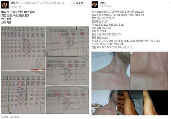 김부선은 "제가 주민들에게 그동안 난방비 및 관리비 비리 제보하려는 순간, 그들이 난입해서 입 막았고 경찰 부르라고 주민들 협박하고 우리가 나가면서 폭언폭력까지 하고 내게 일방적으로 맞았다고 제보했다"고 밝혔다.이어 "증인들이 많습니다. 모르는 아주머니 여섯분이 파출소에 달려갔다 합니다. 김부선 억울하게 당했다고 증언해준다고요. 그때 저랑 전 부녀회장은 병원에 있었구요. 병원에서도 김부선이 때렸다고 병원이 떠나도록 떠들었대요"라고 전했다.또한, 김부선은 "저도 진단서 나왔습니다. 증인들 넙칩니다. 주먹으로 때리고 발로 찼다구요? 왜들 이러세요. 녹취 다 있어요"라며 멍든 자신의 사진을 공개했다.현재 A씨는 "반상회가 열린 당시 안건인 개별난방에 대해서만 토론하자고 건의하자 김부선이 자신의 뜻과 다르다며 욕설을 하며 때렸다"고 주장하고 있다.이에 경찰은 다음주 쯤 김부선과 주민들을 불러 정확한 경위를 조사할 예정이다.[김부선 폭행 혐의 부인, 사진=김부선 페이스북]