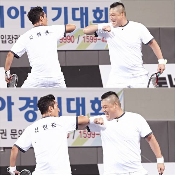 공개된 사진 속 강호동은 '나이스 파트너' 신현준과 주먹을 불끈 쥔 채 팔꿈치를 맞부딪히며 포효하고 있다. 천하장사다운 자신감과 한층 강력해진 테니스 에너지가 물씬 느껴지는 가운데, 강호동의 첫 테니스 실력 공개에 관심이 모아진다.