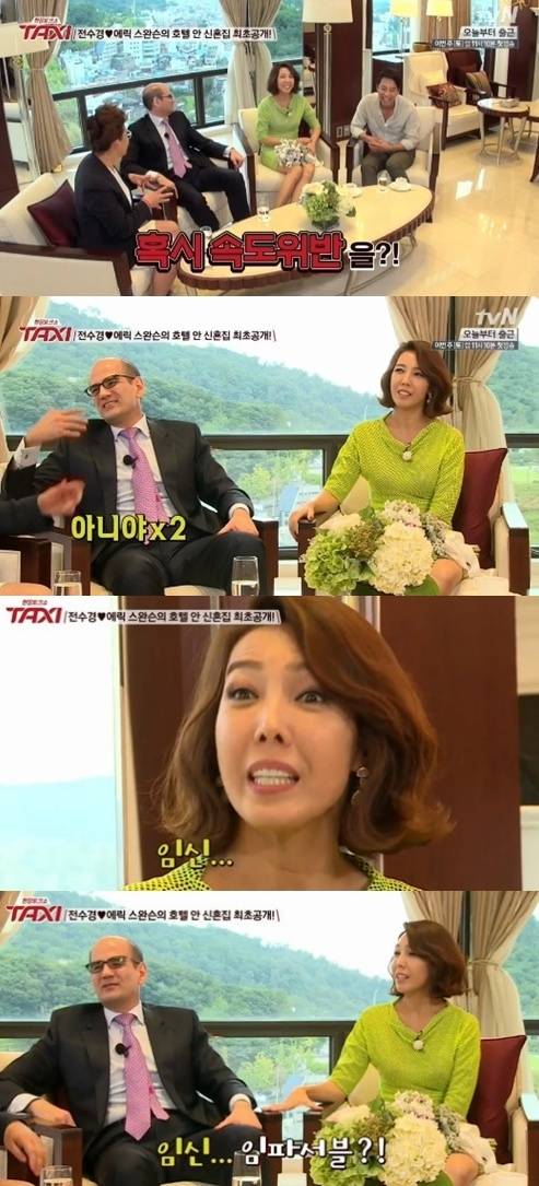 뮤지컬 배우 전수경이 속도위반설에 대해 유쾌하게 해명했다.16일 방송된 tvN '현장토크쇼 택시' 연애말고 결혼 특집 1탄에서는 뮤지컬 배우 전수경과 예비남편이자 H호텔 지배인 에릭 스완슨이 출연해 솔직한 입담을 뽐냈다.이날 MC 이영자는 예비부부 전수경, 에릭 스완슨에게 "결혼을 서두르는 것 같은데 속도위반 아니냐"고 질문했다.이에 에릭 스완슨은 "아니다"라고 거듭 부인했고, 전수경은 "임신? 임파서블이다"고 쿨하게 밝히며 호탕하게 웃었다.한편, 전수경 에릭 스완슨은 오는 22일 서울 힐튼호텔서 4년 열애 끝에 결혼식을 올린다. 두 사람은 2010년 10월 지인의 소개로 처음 만났으며, 바쁜 스케줄로 인해 신혼여행은 가지 않을 예정이다.[택시 전수경, 사진=tvN '택시' 방송 캡처]