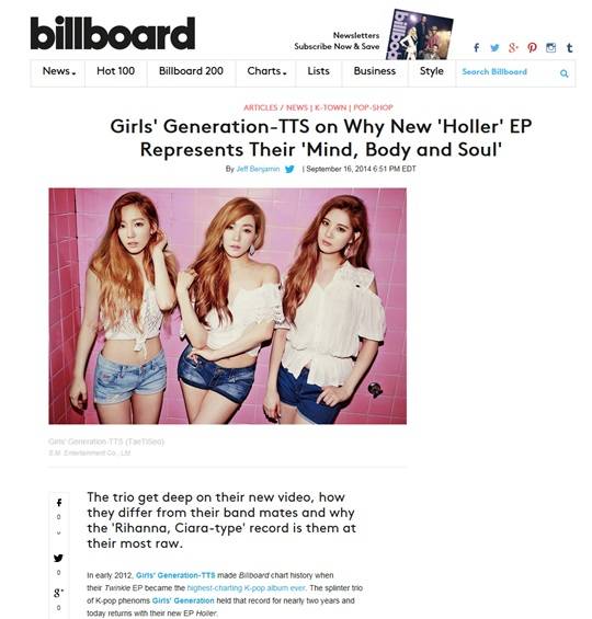 빌보드는 지난 16일(현지시각) K팝 칼럼 코너 K-TOWN을 통해 '소녀시대-태티서의 새 앨범 'Holler'가 그들의 마음, 몸, 영혼을 상징하는 이유(Girls' Generation-TTS on Why New 'Holler' EP Represents Their Mind, Body and Soul)'라는 기사를 게재했다.