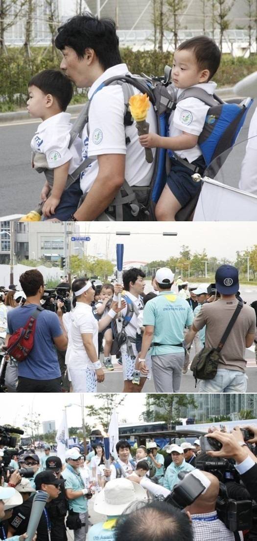 배우 송일국이 세 쌍둥이 대한, 민국, 만세를 안고 업고 인천아시안게임 성화봉송에 나섰다.지난 17일 2014 인천아시아경기대회 공식 SNS에는 "송도의 성자라 불리는 배우 송일국과 우리의 사랑스러운 대한, 민국, 만세도 인천AG 성화에 참여했습니다"라는 글과 함께 사진을 게재했다.송일국과 삼둥이는 이날 오전 인천 연수구에서 진행된 성화 봉송에서 밴쿠버 동계올림픽 여자 쇼트트랙 은메달리스트 이은별 선수와 함께 성화 주자로 참여했다.특히, 송일국은 힘든 기색 없이 대한이를 한 손에 안은 채 만세를 앞에, 민국이를 뒤로 매단 채 달려 시민들의 뜨거운 박수를 받았다.한편, 인천아시안게임 성화대에 불을 붙일 마지막 주자는 오는 19일 개막식 당일에 공개된다.[송일국 삼둥이 성화 봉송, 사진=인천아시아경기대회 공식 SNS]
