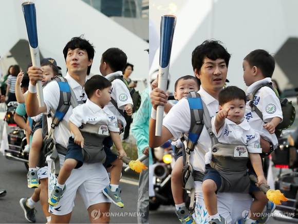 배우 송일국이 삼둥이와 인천아시안게임 성화봉송에 나서며 특급 체력을 과시했다.지난 17일 2014 인천아시아경기대회 성화봉송이 인천 연수구에서 펼쳐졌다. 송일국과 삼둥이 대한, 민국, 만세는 이날 2010 밴쿠버 동계올림픽 여자 쇼트트랙 은메달리스트 이은별 선수와 함께 성화 주자로 참여했다.특히, 송일국은 세 쌍둥이 대한, 민국, 만세를 앞뒤로 업고 안은 채 달려 시민들에게 열렬한 박수와 환호를 받았다.송일국 삼둥이 성화 봉송 소식을 접한 네티즌들은 "송일국 삼둥이 성화 봉송 대단해", "세 쌍둥이 정말 귀여워", "송일국 삼둥이 성화 봉송 철인3종 경기가 따로 없네", "송일국 삼둥이와 성화봉송 멋지다", "송일국 삼둥이 성화 봉송 진정한 슈퍼맨" 등의 반응을 보였다.한편, 인천아시안게임 성화대에 불을 붙일 마지막 주자는 오는 19일 개막식 당일에 공개된다.[송일국 삼둥이 성화 봉송, 사진=연합뉴스]