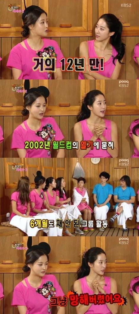 배우 전혜빈, 오연서가 걸그룹 러브(Luv)로 활동했던 과거를 떠올렸다.18일 방송된 KBS 2TV '해피투게더3'에서는 10대부터 50대까지 각 세대별을 대표하는 여배우 금보라, 박주미, 전혜빈, 오연서, 김새론이 출연해 화려한 입담을 과시했다.이날 방송에서는 전혜빈과 오연서가 걸그룹 Luv로로 함께 활동할 당시의 영상이 공개됐다. 영상 속 전혜빈과 오연서는 데뷔곡 '오렌지걸'을 부르며 풋풋하고 귀여운 모습으로 눈길을 사로잡았다.12년 만에 오연서와 방송에 동반출연한 전혜빈은 "저희가 2002년 월드컵 시즌에 데뷔했는데 열기에 묻혀 폭삭 망했다. 6개월도 활동을 못했다"고 털어놨다.이후 오연서와 전혜빈은 MC들의 요청으로 Luv 시절을 회상하며 '오렌지걸'의 안무를 완벽 재연해 분위기를 한껏 달아오르게 했다.[오연서 전혜빈 오렌지걸, 사진=KBS2 '해피투게더' 방송 캡처]