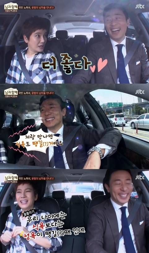 안문숙의 19금 농담에 김범수가 당황했다.지난 17일 방송된 JTBC 재혼 미리보기 '님과 함께'에서는 썸 커플로 등장해 화제가 된 김범수 안문숙이 고정출연을 확정짓고 첫 데이트를 즐기는 모습이 전파를 탔다.이날 김범수와 안문숙은 첫 만남을 가진 후 쇼핑 데이트를 위해 자리를 옮겼다. 이동하는 차 안에서 안문숙은 "우리 소개시켜 준 사람들 없이 이렇게 만나니까 더 좋다"고 솔직하게 밝혔다.이어 안문숙은 "나랑 사귀면 지루하지 않을 것"이라며 "나와 있다보면 식욕도 당길 거다. 사실 우리 나이는 식욕보다 성욕이 더 당길 때인데.."라고 거침없는 발언으로 웃음을 자아냈다.[안문숙 김범수, 사진=JTBC '님과 함께' 방송 캡처]