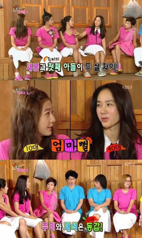 배우 박주미가 김새론의 나이에 놀라움을 드러냈다.지난 18일 방송된 KBS 2TV '해피투게더3'에서는 10대부터 50대까지 각 세대별을 대표하는 여배우 금보라, 박주미, 전혜빈, 오연서, 김새론이 출연해 화려한 입담을 과시했다.이날 박주미는 "오늘 김새론 양을 보고 깜짝 놀랐다. 김새론이 우리 큰 아들이 두 살 차이밖에 안 난다. 김새론의 나이를 듣고 내가 너무 늙었구나 생각했다"고 밝혔다.이에 다른 출연자들이 박주미의 동안미모를 부러워하자 "주름이 안 보일리 없다. 거짓말하지 마라"고 말했다.그러자 1972년생으로 박주미와 동갑인 MC 유재석은 "여기서 보면 박주미의 주름살이 조금 보인다"고 돌직구를 날려 웃음을 자아냈다.['해피투게더' 박주미 김새론, 사진=KBS2 '해피투게더' 방송 캡처]