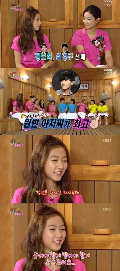 배우 김새론이 영화 '아저씨'에서 호흡을 맞춘 원빈에 대해 언급해 이목을 집중시켰다.지난 18일 방송된 KBS 2TV '해피투게더3'에서는 10대부터 50대까지 각 세대별을 대표하는 여배우 금보라, 박주미, 전혜빈, 오연서, 김새론이 출연해 솔직한 입담을 선보였다.이날 김새론은 가장 기억에 남는 남자배우가 누구냐는 질문에 "정보석, 설경구 아빠 등 많은 분들에게 도움을 받았지만 그래도 원빈 아저씨가 가장 기억에 남는다"고 답했다.이어 MC들이 "원빈은 정말 말이 없냐"며 궁금증을 드러내자 김새론은 "말이 없으시긴 하다. 뭔가 장난을 치긴 치시데 웃어야 할지 말아야 할지 모르겠다"고 답해 웃음을 자아냈다.['해피투게더' 김새론, 사진=KBS2 '해피투게더' 방송 캡처]