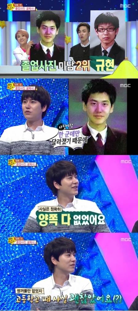 슈퍼주니어 규현의 졸업사진이 공개됐다.지난 18일 방송된 MBC '별바라기' 마지막회에서는 슈퍼주니어 이특, 신동, 은혁, 규현, 려욱과 슈퍼주니어 팬클럽 엘프가 출연해 솔직한 입담을 과시했다.이날 MC 강호동은 슈퍼주니어 멤버들의 졸업사진을 공개했고, 규현의 졸업사진을 본 팬들은 깜짝 놀랐다. 이에 규현은 "왜 그러냐. 난 한군데만 달라졌다"고 당당해했다.규현의 졸업사진을 자세히 살펴보던 강호동은 "쌍꺼풀이 한 쪽에만 있었냐?"고 물었다. 그러자 규현은 "쌍꺼풀이 양쪽 다 없었디"며 성형수술 사실을 솔직하게 고백했다.이어 규현은 "쌍꺼풀만 없었지 중학교 때 사실 외모가 괜찮았다"고 자신감을 드러냈다. 규현의 졸업사진을 본 이특은 "너 그래도 2등이다"며 부러움을 내비쳐 눈길을 끌었다.[별바라기 규현 졸업사진, 사진=MBC '별바라기' 방송 캡처]