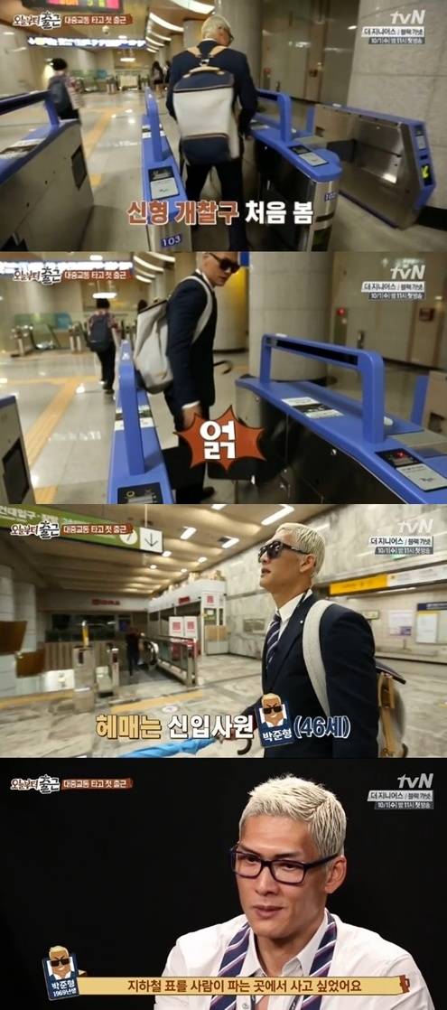 god 박준형이 익숙치 않은 지하철 이용에 진땀을 뺐다.지난 20일 방송된 tvN '오늘부터 출근'에서는 신입사원 박준형, 김성주, 은지원, 로이킴, 홍진호, 김예원 등이 출근을 위해 대충교통을 이용하는 모습이 그려졌다.이날 박준형은 이미 사라진 '토큰'을 언급하며 버스를 타는지를 고민하다가 지하철을 이용하기로 결정하고 역으로 내려갔다.하지만 표를 사는 곳을 찾지 못한 박준형은 지하철 개찰구를 그냥 통과하려고 했고, 개찰구에서 막히자 "표 어디서 사는 거야? 매표소 없잖아. 사람한테 사는 게 없네"라며 어리둥절한 모습을 보였다.박준형은 제작진과의 인터뷰에서 "지하철 표를 사람이 파는 곳에서 사고 싶었다. 컴퓨가 있으니까 당황했다"며 고충을 토로했다.결국 박준형은 자원봉사자의 도움을 받아 자동 판매기를 이용해 표를 구매해 겨우 회사에 도착했다.['오늘부터 출근' 박준형, 사진=tvN '오늘부터 출근' 방송 캡처]