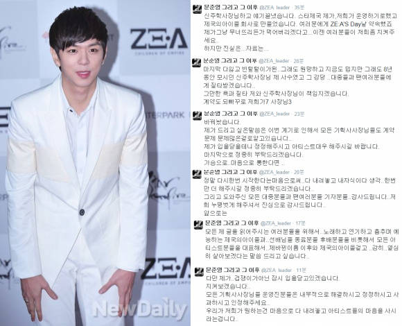 제국의아이들 문준영이 소속사 스타제국 신주학 대표와 결판을 지었다.제아 문준영은 21일 오후 10시께 자신의 트위터를 통해 "제가 지금 신주학 사장님과 결판을 지으러 가겠습니다. 기다려주세요.. 검색어 내리지말아주세요"라는 글을 게재했다.앞서 문준영은 소속사와의 불합리한 계약기간 문제와 수익 배분 등에 언급하며 스타제국 신주학 대표를 겨냥한 강경 발언을 쏟아내 파장을 일으켰다.문준영은 22일 오전 2시쯤 트위터에 "신주학 사장님하고 얘기 끝냈습니다. 스타제국 제가, 저희가 운영하기로 했고 제국의 아이들 회사로 만들었습니다"고 밝혔다.이어 "지금도 밉지만 그래도 8년 동안 모시던 신주학 사장님. 제 사수였고 그 감당은 대중들과 팬 여러분들에게 질타 받겠습니다. 그만한 욕과 질타, 저와 신주학사장님이 책임지겠습니다"라며 "계약도 저희가7 사장님3으로 바꿔놨습니다"고 전했다.문준영은 "제가 드리고 싶은 말씀은 이번 계기로 인해서 모든 기획사 사장님들도 계약문제 많은 걸로 알고 있습니다. 제가 입을 닫을 테니 정정해주시고 아티스트대우 해주시길 바랍니다. 마지막으로 정중히 부탁드리겠습니다. 정말 다시 한 번 시작한다는 마음으로, 다 내려놓고 내 자식이라는 생각 한 번 더 해주시길 정중히 부탁드리겠습니다"고 호소했다.마지막으로 문준영은 "도와주신 모든 대중분들과 팬여러분들 기자분들 감사드립니다. 저희 누명 벗게 해주셔서 진심으로 감사드립니다"며 "겁쟁이가 아닌 잠시 입을 닫고 있겠습니다. 지켜보겠습니다. 모든 기획사 사장님들 운영진분들은 내부적으로 해결하시고 정정하시고 사과하시고 인정해주세요. 우리가 원하는 건 마음으로 다 내려놓고 아티스트들의 마음을 사시라는 겁니다"라고 당부하며 글을 끝맺었다.[제아 문준영 소속사 비판, 사진=뉴데일리 DB/ 문준영 트위터 캡처]