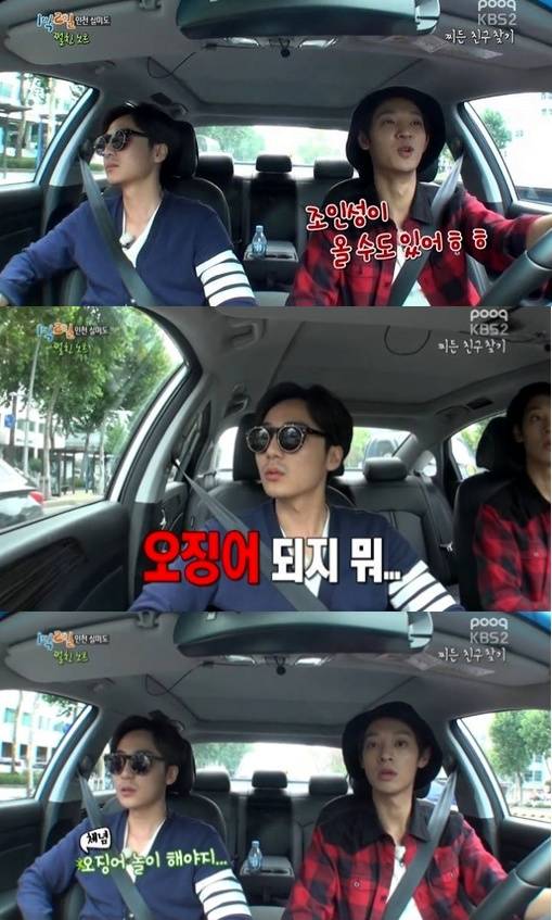 가수 로이킴이 '1박2일' 조인성 등장 소식에 한숨을 크게 내쉬었다.지난 21일 방송된 KBS 2TV '해피선데이-1박2일 시즌3'(이하 '1박2일')는 실미도로 떠난 '쩔친노트 특집'의 첫 번째 이야기가 그려졌다.이날 로이킴은 함께 여행을 가자는 정준영의 제안에 당황하는 모습도 잠시, 손예진이 온다는 솔깃한 말에 "당장 가자"며 태도를 돌변했다.이후 실미도로 이동하는 차안에서 정준영은 "이제와서 얘기하는데 조인성이 올 수도 있다"고 밝혔다. 그러자 로이킴은 "오징어 되지 뭐. 오늘 오징어 놀이 해야지"라고 체념하는 듯한 표정을 지어 웃음을 자아냈다.[1박2일 조인성 등장에 로이킴 반응, 사진=KBS2 '1박2일' 방송 캡처]