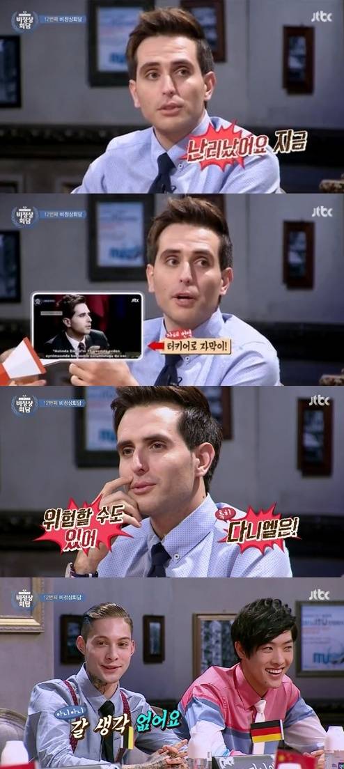 에네스 카야가 고국인 터키에서 자신을 알아볼 정도로 뜨거운 '비정상회담' 인기를 입증했다.22일 방송된 JTBC '비정상회담'에서는 휴가차 지난주 자리를 비웠던 터키 출신 방송인 에네스 카야가 다시 돌아와 현지 반응을 전했다.이날 '비정상회담' 에네스는 "불안해서 죽는 줄 알았다. 터키에 있을 때 줄리안이 난리가 났다고 연락을 받았다. 염소가 없으니 양이 왕이 된다고.."라며 터키 속담을 인용해 복귀 소감을 밝혔다.이어 MC들이 "터키에서 에네스를 알아봤다고 하던데 우리 방송 보고 안 거냐?"고 묻자 에네스는 "지금 난리가 났다. 유튜브 페이지 들어가면 터키어 자막으로 다 나온다"고 말했다.또한, 에네스의 천적인 벨기에 출신 줄리안은 "저랑 호주 다니엘은 터키 가면 위험하지 않냐?"고 질문했다. 이에 에네스는 "너는 모르겠는데 다니엘은 위험할 수 있다. 동영상 댓글 보면 심상치 않다"고 답했고, 다니엘 역시 "터키 갈 생각 없다"고 응수해 웃음을 자아냈다.[비정상회담 에네스, 사진=JTBC '비정상회담' 방송 캡처]