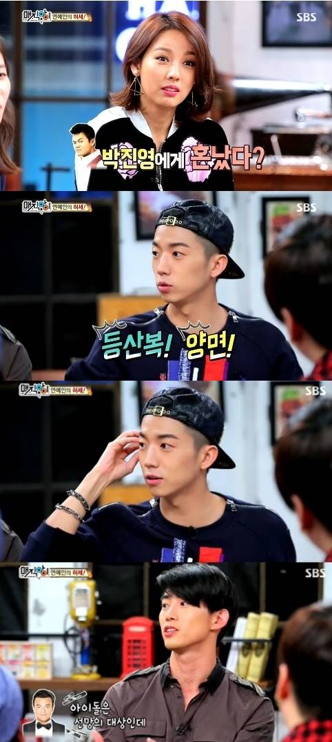 2PM 우영이 공항패션 때문에 박진영에게 혼이 난 사연을 공개했다.지난 23일 방송된 SBS '매직아이'에서는 2PM 우영과 택연, 방송인 오상진, 노민우, 쥬얼리 예원이 출연해 '남자의 허세'에 대한 주제를 놓고 솔직한 입담을 뽐냈다.이날 우영은 연예인들의 공항패션에 대해 이야기를 나누던 중 "평소에 옷을 편하게 입는 편이다. 박진영 형도 우리에게 옷에 대해 뭐라고 하지 않는데 어느 날 공항패션을 지적하더라"고 말했다.이어 "그때 양면으로 입을 수 있는 등산복을 입었다. 편하고 실용성은 최고였는데 그걸 보고 진영이 형이 '왜 저렇게 입었냐. 옷에 신경을 써라'고 했다"고 덧붙였다.이에 택연은 "회사에서 나는 포기했다"며 "진영이 형은 아이돌은 선망의 대상이고 공항패션은 많은 사람이 보는데 너무 편하게 가는 건 예의가 아니라고 조언해주셨다"고 밝혔다.['매직아이' 2PM 우영 공항패션 지적, 사진=SBS '매직아이' 방송 캡처]