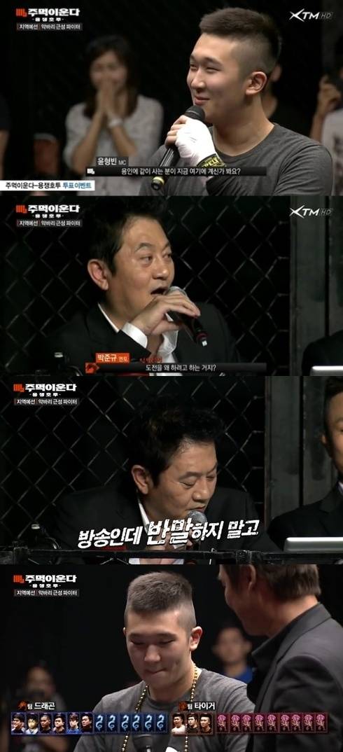 배우 박준규의 아들 박종혁이 '주먹이 운다'에 도전장을 내밀었다.박준규 아들 박종혁은 지난 23일 방송된 XTM '주먹이 운다-용쟁호투'에서 17세 최연소 도전자로 출전해 악바리 근성을 드러냈다.박종혁은 프로 파이터들과 주먹을 맞대며 3분 동안 스파링을 하는 '지옥의 3분'에 당차게 도전하며 10대의 패기를 유감없이 발휘했다.이날 박종혁은 "아빠가 격투기 하는 걸 싫어하는데'주먹이 운다'에 나가서 아빠가 마음이 열렸으면 좋겠다"고 밝혔다. 아들이 링 위에 오른 모습을 본 박준규는 "내가 이걸 봐야 하나"라며 그 어느 때보다 긴장한 모습이 역력했다.결국 좋은 경기력을 보여준 박종혁은 남의철 멘토의 선택을 받았다. 남의철은 "사실 뽑지 않으려고 했다. 박준규 선배님이 불편하다"면서 "내가 종합격투기를 24세 때 데뷔했는데 프로 선수를 상대로 저렇게 못싸웠다. 그래서 기회를 더 줘보고 싶었다"고 이유를 설명했다.['주먹이 운다' 박준규 아들, 사진=XTM '주먹이 운다' 방송 캡처]
