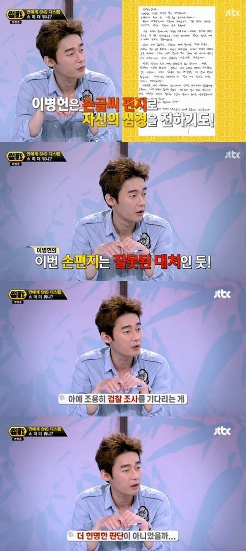 '썰전' 허지웅이 이병헌의 손편지에 대해 일침을 가했다.지난 25일 방송된 JTBC '썰전'에서는 최근 음담패설 동영상 유포 협박 논란에 휩싸인 배우 이병헌에 대한 이야기를 나눴다.이날 MC들은 이병헌이 협박 사건으로 이미지에 큰 타격을 입었다며 입을 모았고 "출구가 없다"라는 여론의 싸늘한 반응을 전했다.'썰전' 허지웅은 "이병헌이 손편지를 써서 본인의 심경을 전달했다"며 "아예 조용히 있던가 아니면 적극적으로 나서던가 해야 하는데 잘못된 대처였고 잘못된 위기 관리였다"고 밝혔다.이어 "차라리 이런 손편지를 공개하기보다는 조용히 검찰 조사를 기다리는게 현명한 판단 아니었을까 생각한다"고 말했다.['썰전' 허지웅 이병헌 손편지 언급, 사진=JTBC '썰전' 방송 캡처]