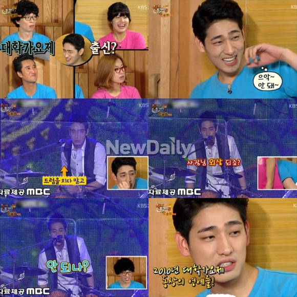 배우 윤박이 대학가요제 출신으로 밝혀졌다.25일 방송된 KBS 2TV '해피투게더3'에는 한솥밥 특집으로 '연예가중계' 팀의 신현준, 박은영, 김생민과 '가족끼리 왜 이래' 팀의 손담비, 윤박, 박형식, 서강준, 남지현이 출연해 솔직한 입담을 뽐냈다.이날 MC 유재석은 "윤박이 대학가요제 출신이라고 하던데"라고 언급하며 당시 대학가요제에 참가한 증거영상을 공개했다.공개된 영상에서 열정적으로 드럼을 치던 윤박은 자리에서 일어나 "사장님 외상 되죠? 안 되나?"라고 느끼한 멘트를 날리며 다시 드럼을 치기 시작했다.이에 스튜디오에 있던 MC들과 게스트들은 오글거림을 참지 못했고, 당사자인 윤박은 민망함에 고개를 숙였다. 윤박은 2010년 대학가요제에서 동상을 받았다.['해피투게더' 윤박, 사진=KBS2 '해피투게더' 방송 캡처]
