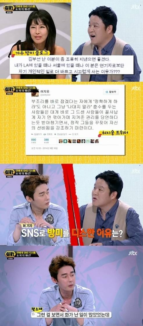 허지웅이 김부선을 옹호하고 방미를 디스한 이유를 밝혔다.지난 25일 방송된 JTBC '썰전' 예능심판자 코너에서는 최근 난방비 비리 문제로 아파트 주민과 갈등을 빚은 배우 김부선에 대해 이야기를 나눴다.앞서 방미는 난방비 비리를 폭로를 한 김부선을 향해 "난 이분이 좀 조용히 지냈으면 좋겠다"라는 글을 게재해 네티즌들의 비난을 받았다. 허지웅 역시 김부선을 저격한 방미에 대해 "꼴 사납다"라는 디스글을 남겨 화제를 모았다.이에 허지웅은 "굉장히 많은 사람들이 사회 진보의 한 걸음을 위해 드센 싸움을 하는데, 거기에 '왜 굳이 저럽게 시끄럽게 해?'라고 선비인 척을 하거나 '도로 막히게 시위하고 난리야' 식으로 이야기 해놓고 나중에 한 걸음 나아간 사회적 자산의 단물은 쪽쪽 빨아 먹는다"고 말했다.이어 "그게 너무 싫다. 그런 걸 보면서 평소가 화가 난 일이 많았는데 이 얘기를 보면서 똑같이 생각이 들었다. 그래서 그런 글을 썼다"고 덧붙였다.[썰전 허지웅, 사진=JTBC '썰전' 방송 캡처]