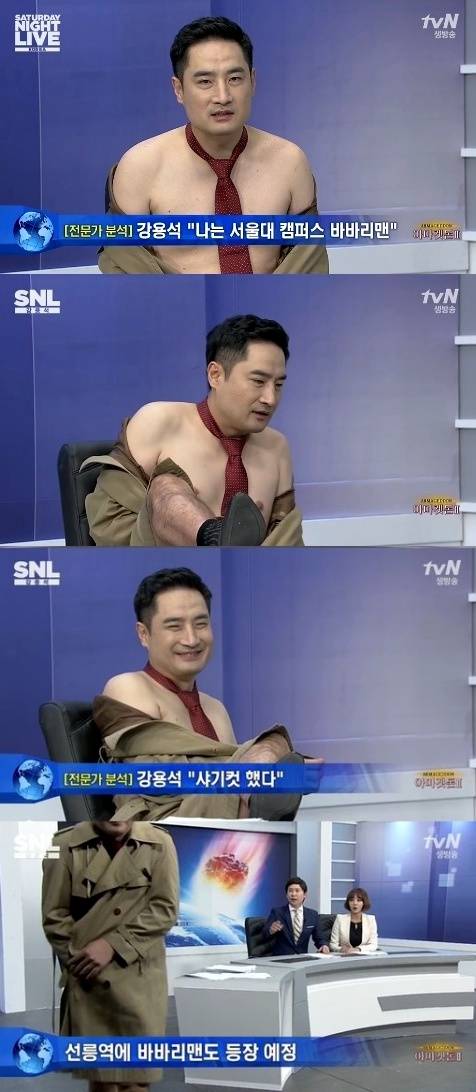 'SNL' 강용석이 바바리맨으로 충격 변신했다.지난 27일 방송된 tvN 'SNL 코리아 시즌3'에서는 변호사 겸 방송인 강용석이 호스트로 출연해 솔직한 입담과 코믹한 연기 변신으로 눈길을 끌었다.이날 뉴스 앵커로 등장한 신동엽은 지구 종말 1시간 전 아비규환의 상황을 전하며 볍률전문가 강용석을 스튜디오에 초대했다.강용석은 상의를 탈의한 채 넥타이와 양말만 몸에 걸치고 "저는 사실 서울대 재학 시절부터 캠퍼스 바바리맨이었다. 현재까지도 짬짬이 활동을 해왔다. 인류 멸망 전 보여줄 수 있어 기분이 좋다"고 고백했다.이어 갑자기 다리를 벌린 강용석은 "어때요? 신동엽의 거기와는?"이라고 19금 돌직구 질문을 던졌다. 강용석의 도발에 깜짝 놀란 신동엽은 "그 곳에 샤기컷을 한 거냐?"고 되받아쳤고, 강용석은 "얼마 전에 새로 했다. 괜찮죠?"라고 답해 폭소를 자아냈다.[SNL 강용석 바바리맨, 사진=tvN 'SNL코리아' 방송 캡처]