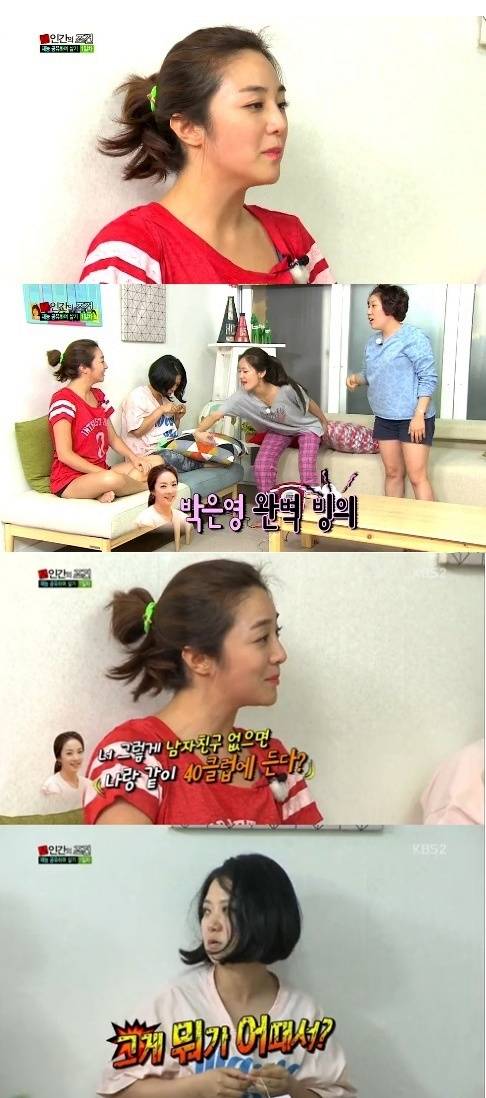 '인간의 조건' 정다은이 자신을 가장 괴롭히는 아나운서 선배로 박은영을 꼽았다.27일 방송된 KBS 2TV '인간의 조건'에서는 '재능 공유하며 살기' 체험에 도전하는 김숙, 김신영, 김지민, 김영희, 신보라, 정다은 등 여성 멤버들의 모습이 그려졌다.이날 숙소에서 이야기를 나누던 중 정다은은 "혹시 괴롭히는 선배가 있느냐?"는 질문에 박은영 아나운서를 지목하며 "내가 반바지를 입고 가면 바로 '너 그거 짧은데?'라고 지적한다"고 밝혔다특히, 정다은은 박은영 특유의 말투와 행동을 완벽하게 따라해 웃음을 자아냈다. 이어 정다은은 "심지어 박은영 선배가 '너 그렇게 남자친구가 없으면 나와 같이 40클럽에 든다. 40클럽은 마흔까지 결혼 안하는 삶'이라고 놀린 적도 있었다"고 말했다.이에 옆에서 조용히 뜨개질을 하고 있던 개그우먼 김숙은 싸늘한 표정으로 "그게 뭐 어때서?"라고 물어 정다은을 당황하게 만들었다.['인간의 조건' 정다은, 사진=KBS2 '인간의 조건' 방송 캡처]