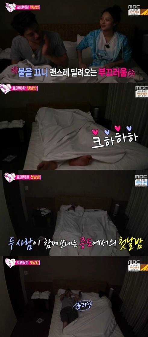 '우리 결혼했어요' 홍종현 유라가 한 침대에 누워 달달한 이불싸움을 했다.지난 27일 방송된 MBC '우리 결혼했어요 시즌4'(이하 '우결')에서는 유라를 위해 깜짝 100일 이벤트를 준비하는 홍종현의 모습이 그려졌다.이날 증도에서 홍종현과 유라는 100일 기념으로 선물을 교환하고 와인을 마시며 자축했다. 이후 두 사람은 마스크팩을 하고 침대에 누워 야릇한 분위기를 연출했다.팩이 끝난 후 홍종현은 불을 껐고, 유라와 침대에 나란히 누웠다. 하지만 한 침대에서 부끄러운 두 사람은 괜스레 이불 뺏기 장난을 치며 알콩달콩 애정행각을 벌였다. 결국 홍종현은 이불을 유라에게 양보하고 샤워가운으로 몸을 덮었다.['우리 결혼했어요' 홍종현 유라, 사진=MBC '우결' 방송 캡처]