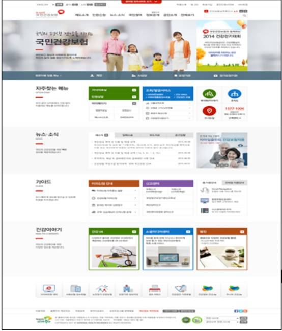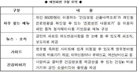 또한 ‘방문자별 맞춤메뉴’를 신설하여 개인․사업장․요양기관․장기요양기관으로 세분화하여 이용자 중심의 디자인으로 구성하고 ‘분야별업무사이트 바로가기’ 메뉴를 모든 페이지 상단에 배치하여 간편하게 각각의 업무사이트로 이동할 수 있도록 했다.