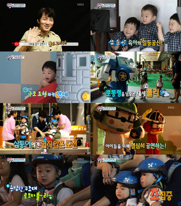 이렇게 삼둥이의 무한 애정을 받고 있는 '로보카폴리'와 삼둥이의 첫만남은 흥미진진했다. 하지만 폴리와의 즐거운 만남도 잠시, 무시무시한 레펠 타기 훈련에 돌입해 삼둥이는 울음을 터뜨렸다.