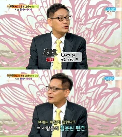 IQ 210 김웅용 교수가 '천재'라는 수식어에 대한 불편한 속내를 드러냈다.IQ 210으로 역사상 가장 아이큐가 높은 인물 4위에 오른 김웅용 교수는 29일 오전 방송된 KBS 2TV '여유만만'에 출연해 파란만장한 인생사를 털어놨다.김웅용은 세계 권위 있는 인명사전인 ABI의 21세기 위대한 지성으로도 뽑힐 만큼 높은 아이큐를 가지고 있다. 1살에는 한글과 천자문을, 3살에는 미적분을, 4살에는 대학에 입학해서 청강 수업을 받았다.이날 IQ 210 김웅용 교수는 "천재라고 불리는 게 싫다. 다른 사람들은 천재라고 하면 뭐든지 다 잘한다고 알고 있는데 그렇지 않다. 한 분야에 특출난 것이다. 수학을 남보다 조금 일찍 배웠다"고 밝혔다.또한, "못하는 게 있느냐"는 MC들 질문에 "길 눈이 어렵다. 3번 꺾어지면 모른다. 근데 내가 길을 못찾으면 사람들이 '천재라는 사람이 길도 모르냐'고 한다"고 말했다.[IQ 210 김웅용 교수, 사진=KBS2 '여유만망' 방송 캡처]
