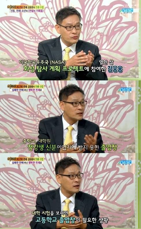 IQ 210 김웅용 교수가 한국에서 취업에 실패한 이유를 공개했다.역사상 가장 아이큐가 높은 인물 4위에 오른 김웅용 교수는 29일 오전 방송된 KBS 2TV '여유만만'에 출연해 파란만장한 인생사를 털어놨다.8살에 나사(NASA)에 스카우트 됐던 김웅용 박사는 7년 정도 있다가 1978년 나사에서 나왔다. 그는 "똑같은 일만 계속하는 시간이 지나갔다. 그러다 사춘기가 왔고, 집에 가고 싶다고 말했지만 사람들은 조국과 민족을 위해 참으라고만 했다"고 밝혔다.이어 "당시 내가 우울증이란 걸 모르고 '왜 머리가 아프지. 왜 흥미가 떨어지지'라는 생각만 했다"며 "행복을 위해 나사를 탈출했다. 한국으로 돌아왔을 때 언론의 비난때문에 힘들었다"고 고백했다.또한, 김웅용 교수는 "한국에 돌아와서 연구소에 취직을 하려고 다니고 싶은 연구소를 찾아서 지도교수님의 추천과 포트폴리오를 들고 찾아갔다. 근데 대학 졸업장이 없기 때문에 받아줄 수 없다고 하더라. 그렇게 몇 군데에서 똑같은 대답을 듣고 거절을 당했다"고 말했다.[IQ 210 김웅용 교수, 사진=KBS2 '여유만만' 방송 캡처]