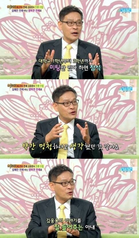 IQ210 김웅용 교수가 아내를 만나게 사연을 털어놨다.IQ 210으로 역사상 가장 아이큐가 높은 인물 4위에 오른 김웅용 교수는 29일 오전 방송된 KBS 2TV '여유만만'에 출연해 파란만장한 인생사를 공개했다.이날 IQ210 김웅용 교수는 "대학교 1, 2학년 초에만 해도 미팅만 있으면 다 참석했다. 1년 동안 100번을 했다"고 밝혀 놀라움을 자아냈다.이어 "당시는 휴대전화가 있을 때가 아니었다. 미팅을 하고 마음에 들면 주소를 교환하고 편지를 썼는데 대부분 퇴짜를 맞았다"며 "아마 날 약각 멍청하다고 생각했던 것 같다"고 덧붙였다.또한, 김웅용 교수는 "이후 현재 아내를 동아리에서 만났다. 아내는 내 얘기를 잘 들어줬다. 내가 천재소년으로 유명했다는 걸 알게 된 후에도 내 앞에서 전혀 티를 내지 않았다"고 말했다.[IQ 210 김웅용 교수, 사진=KBS2 '여유만만' 방송 캡처]