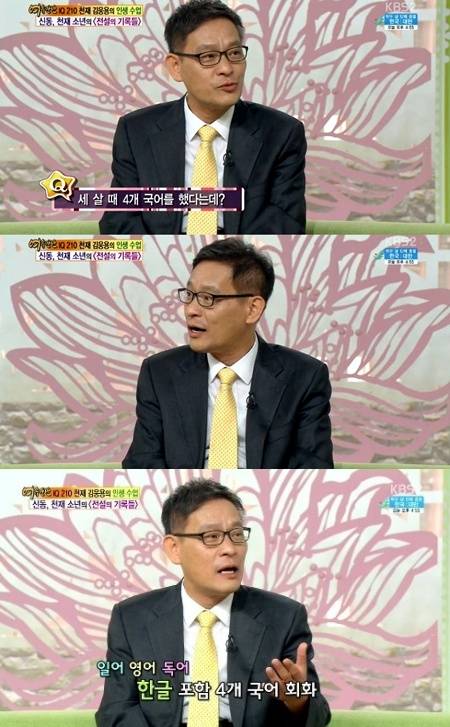 '천재소년'으로 불린 IQ 210 김웅용(52) 교수가 3세 때 4개국어를 구사한 비결을 공개했다.IQ 210으로 역사상 가장 아이큐가 높은 인물 4위에 오른 김웅용 교수는 29일 오전 방송된 KBS 2TV '여유만만'에 출연해 파란만장한 인생사를 털어놨다.이날 MC 조영구는 1978년판 세계 기네스북 책을 꺼내들었다. 해당 책에는 'IQ 210의 한국 소년은 4년 8개월의 나이에 4개의 언어를 말하며 동시를 짓고 적분을 풀 수 있다'라는 내용이 담겨 있다.IQ 210 김웅용 교수는 3살 때 4개 국어를 한 비결로 외신기자들을 꼽았다. 그는 "당시 내가 천재라고 소개가 되니 신문에 많이 나왔다. 외국에서 나를 취재하러 오신 기자들이 많았다"고 설명했다.이어 김웅용 교수는 "기자 분들이 우리 집에서 1달에서 2달 정도 묵으면서 내 생활을 찍어갔는데 그때 배운 것"이라며 "주로 일본, 독일, 미국 기자 분들이 왔으니 그쪽 언어를 배울 수 있었다"고 덧붙였다.[IQ 210 김웅용 교수, 사진=KBS2 '여유만만' 방송 캡처]