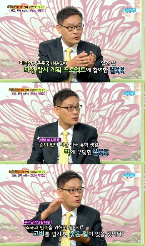 IQ210 김웅용 교수가 천재소년으로 보냈던 어린시절 우울증을 겪었다고 고백했다.역사상 가장 아이큐가 높은 인물 4위에 오른 김웅용 교수는 29일 오전 방송된 KBS 2TV '여유만만'에 출연해 파란만장한 인생사를 공개했다.IQ210 김웅용은 세계 권위 있는 인명사전인 ABI의 21세기 위대한 지성으로도 뽑혔으며, 천재들만 자리할 수 있다는 NASA에서 청소년기를 보낼 만큼 남다른 이력을 가지고 있다.8세에 건국대학교를 졸업한 김웅용 교수는 미항공우주국(NASA)의 연구원으로 발탁돼 미국 유학을 떠났다. 그는 "당시 미국과 소련이 경쟁하던 시절이었다. NASA 선임 연구관으로 발탁돼 화성 탐사 계획 프로젝트에 투입됐다. 내가 주로 하는 일은 역행렬(행렬식을 거꾸로 만들어서 푸는 것)이었다"고 설명했다.또한, 김웅용 교수는 "똑같은 일만 계속하는 시간이 지나갔다. 그러다 사춘기가 왔고, 집에 가고 싶다고 말했지만 사람들은 조국과 민족을 위해 참으라고만 했다"고 털어놨다.이어 "당시 내가 우울증이란 걸 모르고 '왜 머리가 아프지. 왜 흥미가 떨어지지'라는 생각만 했다"며 "행복을 위해 나사를 탈출했다. 한국으로 돌아왔을 때 사람들은 왜 장래가 보장된 직장을 버리고 나왔냐고 했지만 그건 당사자가 아니면 모르는 일이다"고 말했다.[IQ 210 김웅용 교수, 사진=KBS2 '여유만만' 방송 캡처]