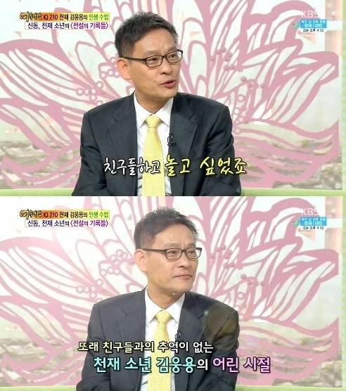 IQ 210 김웅용 교수가 어린시절 친구가 없었다고 털어놨다.김웅용 교수는 29일 오전 방송된 KBS 2TV '여유만만'에 출연해 '천재소년'으로 불리던 어린시절 일화를 공개했다.IQ 210으로 역사상 가장 아이큐가 높은 인물 4위에 오른 IQ210 김웅용은 생후 80일에 걸어 다니고 1살에는 한글과 천자문을, 5살에는 미적분 문제를 풀었으며, 8세에 미항공우주국(NASA)의 연구원으로 뽑혔다.이날 김웅용 교수는 "어린 시절에는 친구가 그리웠다. 친구들과 뛰어놀았던 기억이 없다"며 "친구들이 다 아줌마 아저씨들이었다. 난 신체는 어리니까 그 분들과 함께 할 수 있는 게 있고 없는 게 있었다"고 고백했다.또한, 김 교수는 "타임머신을 타고 돌아간다면 어떻게 하겠느냐"는 질문에 "일단 어린이집에 갈 것 같다. 그곳에 내 또래 아이들이 있을 것 아니냐. 함께 뛰어놀고 친해지고 싶다"고 밝혔다.[IQ 210 김웅용 교수, 사진=KBS2 '여유만만' 방송 캡처]