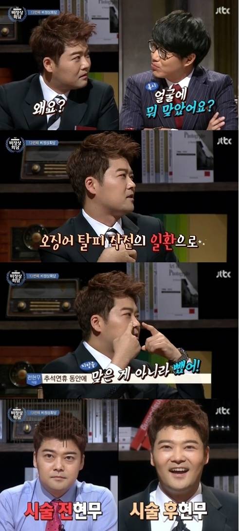 '비정상회담' 전현무가 얼굴 지방 제거 시술을 고백했다.지난 29일 방송된 종합편성채널 JTBC '비정상회담'에서 성시경은 전현무의 얼굴을 보고 "혹시 얼굴에 뭐 맞았느냐? 왜 이렇게 부었냐"며 의아함을 드러냈다.유세윤 역시 "얼굴 라인이 달라졌다. 지방 맞은것 아니냐"고 추궁했다. 결국 전현무는 "매주 비정상회담 멤버들과 함께하다 보니 내가 너무 오징어 같이 나오더라. 추석 연휴 동안 지방 주사를 맞은 게 아니라 뺐다"고 밝혔다.'비정상회담' 전현무의 시술 고백에 제작진은 그의 시술 전후를 비교한 모습을 공개해 웃음을 자아냈다.['비정상회담' 전현무 시술 고백, 사진=JTBC '비정상회담' 방송 캡처]