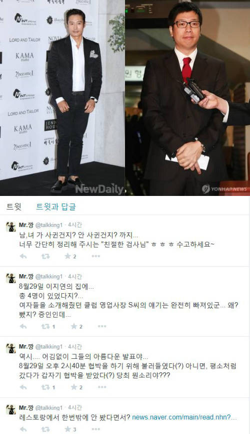 이어 "8월 29일 이지연의 집에 총 4명이 있었다지? 여자들을 소개해줬던 클럽 영업사장 S씨의 얘기는 완전히 빠져있군. 왜? 뺐지? 증인인데.."라며 "남녀 가 사귄건지 안 사귄건지까지 너무 간단히 정리해 주시는 '친절한 검사님' 수고하세요"라고 덧붙이며 수사결과에 의혹을 제기했다.