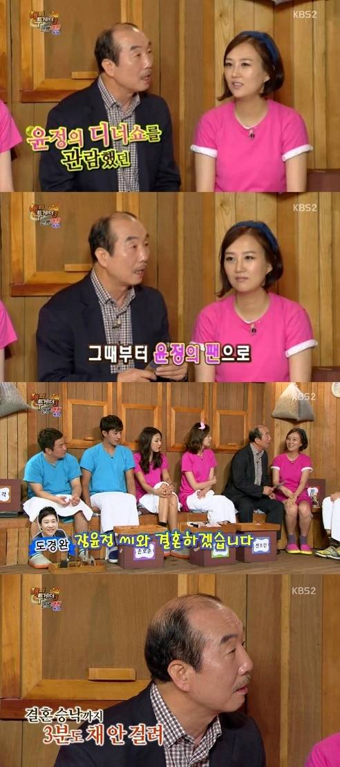 KBS 아나운서 도경완의 아버지가 장윤정이 아들과 결혼하기 전부터 열혈팬이었다고 고백했다.지난 2일 방송된 KBS 2TV '해피투게더 시즌3'에는 '인생역전' 특집으로 가수 장윤정, 허각, 배우 전소민, 손호준, 모델 한혜진이 출연해 솔직한 입담을 뽐냈다.이날 깜짝 등장한 도경완 아버지이자 장윤정 시아버지인 도봉수 씨는 "5년 전 부부 동반모임에서 장윤정 디너쇼를 관람했다. 그때 '첫사랑'이라는 노래를 불렀는데 정말 잘 하더라. 그때부터 팬이 됐다"고 밝혔다.이어 MC 박미선은 도경완 아버지에게 "장윤정이 며느리로 온다는 얘기를 듣고 기분이 어땠냐?"고 질문했다.이에 "어느 날 도경완과 식사 중 장윤정과 결혼하겠다고 하더라. 내가 윤정이를 정말 좋아하는 팬이라 밥 한 숟가락 먹고 바로 승낙했다. 3분도 채 안 걸렸다"고 남다른 며느리 사랑을 드러냈다.[해피투게더 장윤정 시아바지, 사진=KBS2 '해피투게더' 방송 캡처]