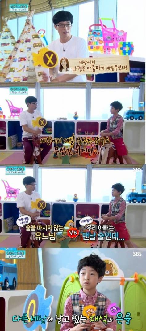 '붕어빵' 유재석이 아내 나경은을 언급했다.유재석은 지난 5일 방송된 SBS '스타 주니어쇼 붕어빵' 스페셜 코너 '꼭 만나고 싶어요'에서 개그맨 염경환의 아들 은률 군의 멘토로 깜짝 출연했다.이날 염은률 군은 "아내 나경은이 세상에서 제일 무섭냐"고 질문했고, 유재석은 "그렇지 않다. 무서운 건 사실이지만.."이라고 털어놨다.이에 염은률은 "술을 마시고 들어갈 때 무섭지 않느냐"고 의아함을 드러냈다. 하지만 유재석은 "나는 술을 마시지 않는다. 그래도 무서울 때가 있다"고 답해 은률 군을 놀라게 했다.[붕어빵 유재석, 사진=SBS '붕어빵' 방송 캡처]