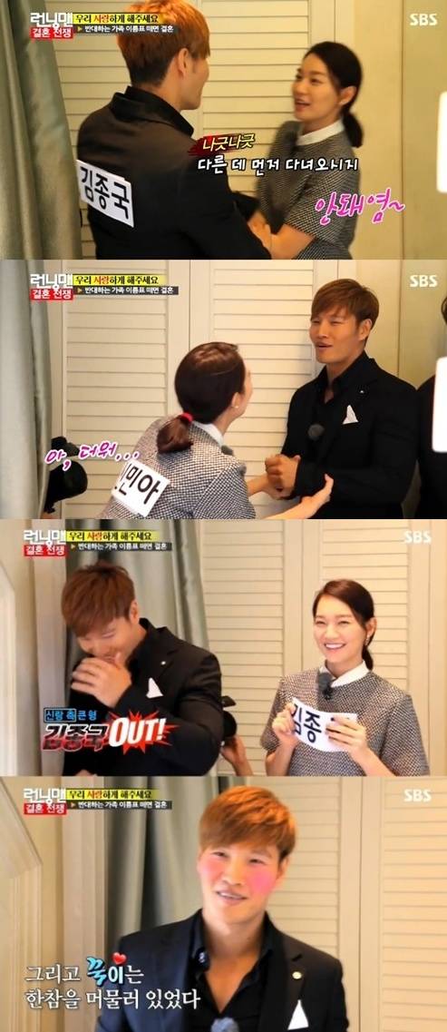 '런닝맨' 신민아에 '능력자' 김종국이 무장해제 됐다.지난 5일 방송된 SBS '일요일이 좋다-런닝맨'에서는 영화 '나의 사랑 나의 신부'의 신민아와 조정석이 게스트로 출연해 '런닝맨' 멤버들과 불꽃 튀는 '연애 다음 결혼' 레이스를 펼쳤다.이날 신민아와 개리는 신랑 신부가 돼 30분 동안 '런닝맨' 멤버들의 이름표를 떼야 했다. 두 사람은 멤버들을 찾아 나섰고, 이 과정에서 신민아는 커튼 뒤에 숨어있는 김종국을 발견해 일대일 매치를 하게 됐다.신민아가 자신의 이름표를 떼려고 하자 김종국은 "다른 데 먼저 다녀오라"고 말했고, 신민아는 애교 섞인 목소리로 "안돼염~"이라고 밝혔다.이어 신민아는 김종국의 두 팔을 붙잡고 "아 더워"라고 지친 듯한 표정을 지으며 애원했다. 이에 김종국은 얼굴이 빨개지며 자신의 등을 그대로 내줘 웃음을 자아냈다.[런닝맨 신민아, 사진=SBS '런닝맨' 방송 캡처]