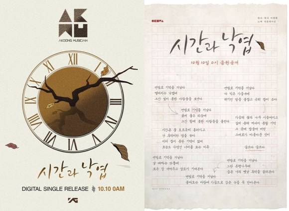 남매듀오 악동뮤지션이 신곡 '시간과 낙엽'을 기습 발표하는 가운데 가사를 공개했다.악동뮤지션은 9일 오후 3시 YG 공식블로그를 통해 '시간과 낙엽'의 가사를 담은 카운터를 게재해 눈길을 끌고 있다.악동뮤지션의 신곡 '시간과 낙엽'은 10월 발매를 위해 지난 4월 발표한 데뷔 앨범 'PLAY'에서 공개하지 않았던히든 트랙으로 데뷔 앨범 전곡과 마찬가지로 이찬혁이 작사, 작곡을 맡았다.감미로운 스트링 섹션과 피아노 사운드가 인상적인 POP 장르의 곡으로 그 동안 들었던 악동뮤지션의 노래와는 또 다른 색깔을 지닌 것으로 전해져 기대를 모은다.특히, 최근 가사에서 영어의 사용이 부쩍 잦아진 다른 노래들과 달리 가사 전체가 한글로만 돼 있어 관심을 집중시킨다.한편, 악동뮤지션은 신곡 공개와 함께 오는 11월 21일부터 23일까지 서울 한남동 블루스퀘어 삼성카드홀에서 첫 번째 투어콘서트 '악뮤캠프'를 개최한다.[악동뮤지션 '시간과 낙엽', 사진=YG엔터테인먼트]